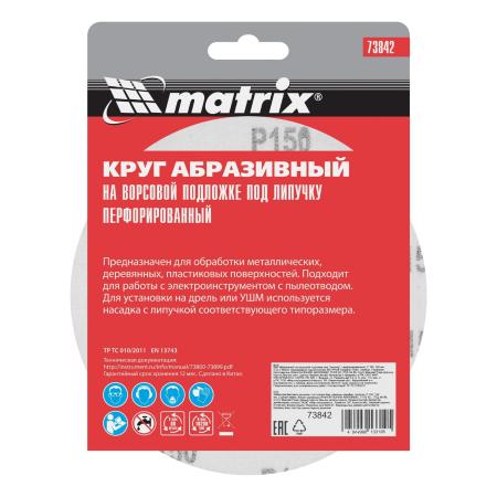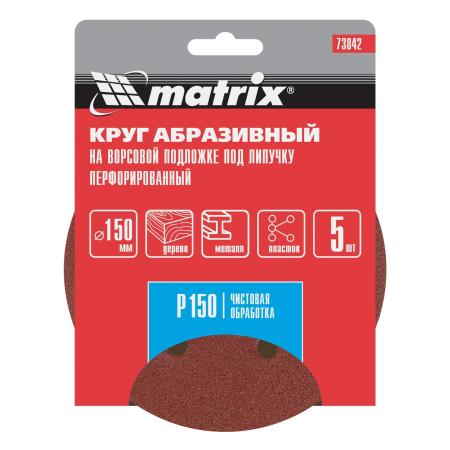 Круг абразивный на ворсовой подложке под "липучку", перфорированный, P 150, 150 мм, 5 шт.// Matrix