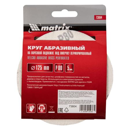 Круг абразивный на ворсовой подложке под "липучку", перфорированный, P 80, 125 мм, 5 шт.// Matrix