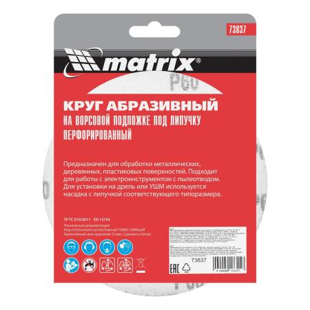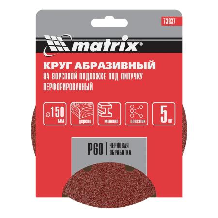 Круг абразивный на ворсовой подложке под "липучку", перфорированный, P 60, 150 мм, 5 шт.// Matrix