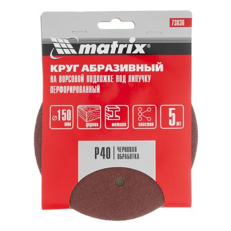 Круг абразивный на ворсовой подложке под "липучку", перфорированный, P 40, 150 мм, 5 шт.// Matrix