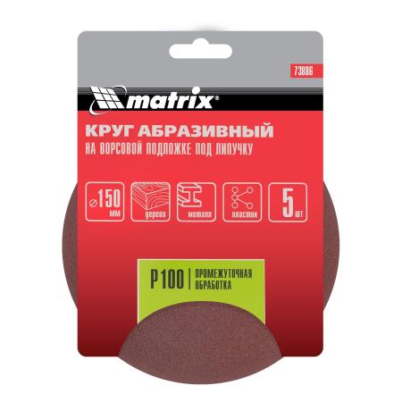 Круг абразивный на ворсовой подложке под "липучку", P 100, 150 мм, 5 шт.// Matrix