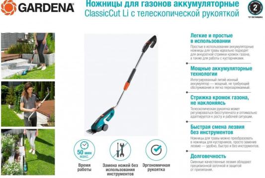 Прочие особенности и свойстваС помощью садовых ножниц GARDENA ClassicCut Li можно удобно и точно обрезать края газона. Аккумуляторные ножницы для травы хорошо лежат в руке благодаря эргономичной рукоятке. Качественные лезвия обеспечивают идеальные результаты стрижки и могут быть заменены одним нажатием кнопки, без инструментов. Таким образом, ножницы для травы можно легко превратить в ножницы для кустарников. Со встроенным, простым в уходе литий-ионным аккумулятором. Аккумулятор можно быстро перезарядить в любое время, не опасаясь эффекта памяти. Чехол для ножа и зарядное устройство входят в комплект.