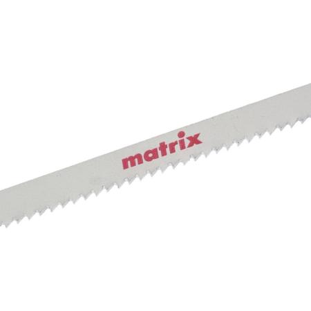 Прочие характеристики и свойстваПолотна для электролобзика торговой марки Matrix осуществляют быстрый криволинейный пропил строительной древесины, мягкой древесины (5–100 мм), ДСП, столярных плит, ДВП.