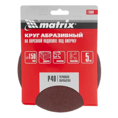 Круг абразивный на ворсовой подложке под "липучку", P 40, 150 мм, 5 шт.// Matrix