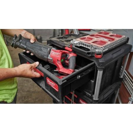 PACKOUT Ящик Milwaukee идеально подходит для хранения различных инструментов, таких как гаражные ключи, шлифовальные машинки, а также другие необходимые предметы. Его компактная конструкция позволяет легко перемещать его по рабочему помещению или на склад.