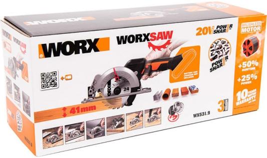 Циркулярная мини-пила аккумуляторная бесщеточная 120 мм 20В WORX worxsaw WX531.9, без АКБ и ЗУ