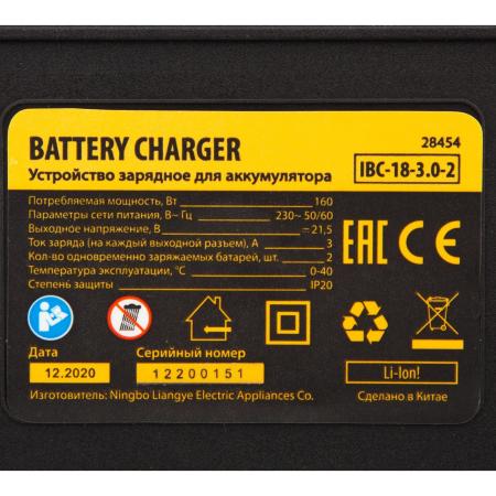 Устройство зарядное для аккумуляторов IBC-18-3.0-2, Li-Ion, 18В, 3,0 А, для двух батарей // Denzel