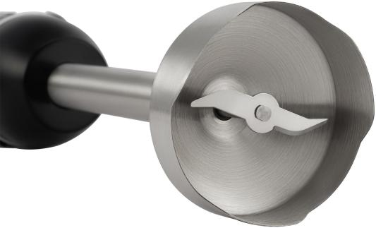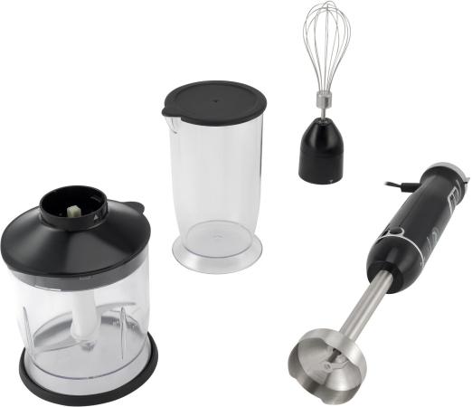 В комплекте идет мерный стакан и измельчитель, а также шнуру длиной 0,85 метра. Блендер выполнен из прочного пластика, металлической погружной части и имеет механическую систему управления.