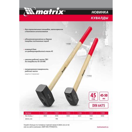 Кувалда, 8000 г, кованая головка, деревянная рукоятка 900 мм // Matrix