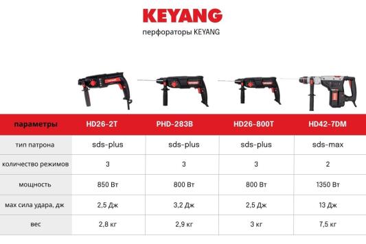 Прочие особенности и свойстваПерфоратор Keyang PHD283B подходит для сверления анкерных и крепёжных отверстий диаметром 4-28 мм в бетоне и каменной кладке. Функционирует в трёх режимах: сверление, ударное сверление и долбление.
