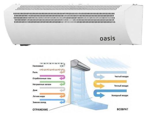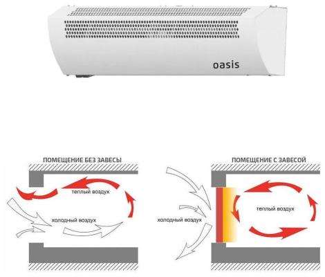 Прочие особенности и свойстваТепловая завеса OASIS TZ-9 4640015387954 устройство, создающее направленный воздушный поток, препятствующий проникновению внутрь помещения холодного наружного воздуха. Прибор снижает тепловые потери в помещении. Летом завеса может выполнять функцию защиты кондиционируемого помещения от проникновения внутрь теплого наружного воздуха, пыли, дыма, насекомых и т. п.