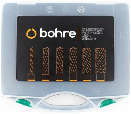Bohre Набор сверл корончатых по металлу HSS 13,15,17,19,21,23 мм х50, Weldon 19, штифт 6,34х103 КБ003624