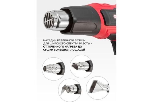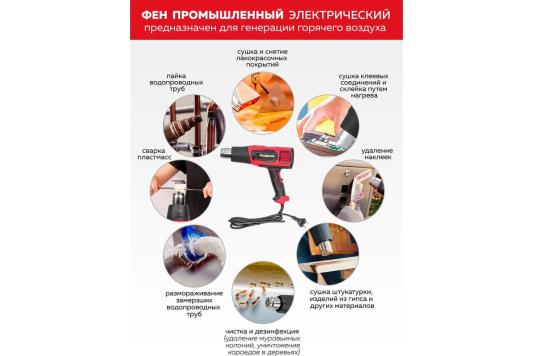 Удобство использования. Благодаря смене режимов возможна работа с различными материалами. Увеличенные диаметры нагревательных нитей исключают перегорание. 4 различные насадки в комплекте позволяют выполнять любую работу – от точечного нагрева до сушки больших площадей. Термопредохранитель для защиты изделия и нагревательного элемента от выхода из строя из-за перегрева. Тип фена: технический. Керамический изолятор: есть Защита от перегрева: есть. Количество насадок: 4 + скребок. Длина кабеля: 180 сантиметров.