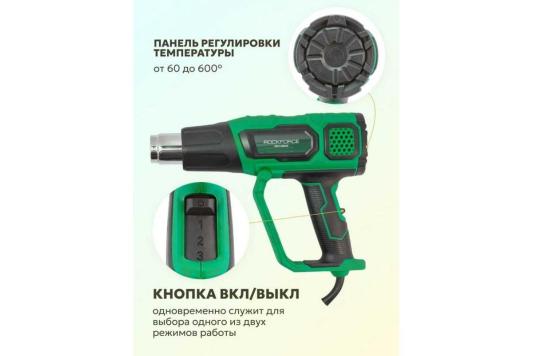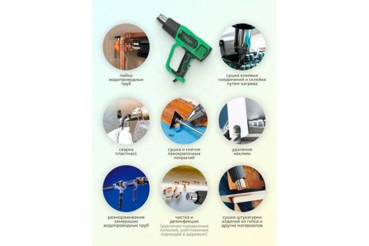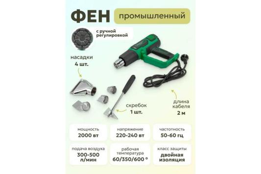 Прочие особенности и свойстваПромышленный фен с насадками ROCKFORCE RF-HG70-2000LED используется для сварки изделий из ПВХ, сушки красок и клея, удаления герметиков, ЛКМ и т.д. Имеет 3 режима температуры воздушного потока и двойную изоляцию двигателя. Фен промышленный электрический с насадками от бренда ROCKFORCE. 3 режима работы. класс защиты - двойная изоляция. Предназначен для генерации горячего воздуха: используется для сушки и снятия лакокрасочных покрытий, для сушки клеевых соединений и склейки путем нагрева, для сушки штукатурки, изделий из гипса и других материалов. 3 режима работы с разной температурой и потоком. Благодаря смене режимов возможна работа с различными материалами. Увеличенные диаметры нагревательных нитей исключают перегорание. 4 различные насадки в комплекте позволяют выполнять любую работу – от точечного нагрева до сушки больших площадей. Термопредохранитель для защиты изделия и нагревательного элемента от выхода из строя из-за перегрева.