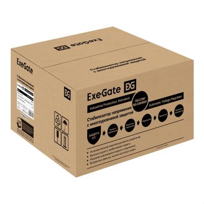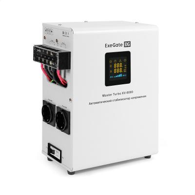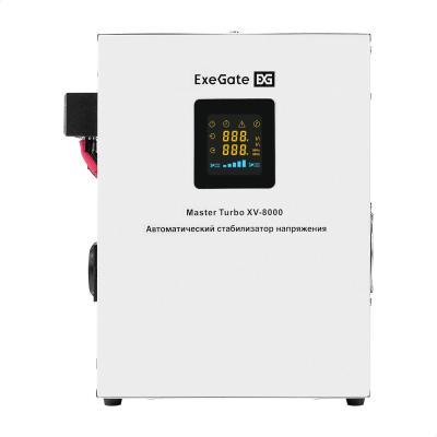 Стабилизатор напряжения настенный ExeGate Master Turbo XV-8000 (8000ВА, вход 80-265В, цветной дисплей, выход 220В±8%, КПД 98%, 5 уровней защиты, задержка, усиленный метал.корпус, 2*Schuko+клем.колодка, RTL)